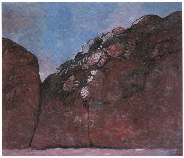 Right now I feel I’m not pushing and changing these works hard enough, yet I’m also wanting to live with them for longer. I’ve noticed how my comprehension of the work changes over time. Only this morning, in the work above, did I see the deep red/brown area as a stage or platform with forms sitting upon it against a green vertical backdrop. Previously my concerns lay with the strip running diagonally across the work and how it sits in relation to the areas above and below. It may still need to come forward some more.